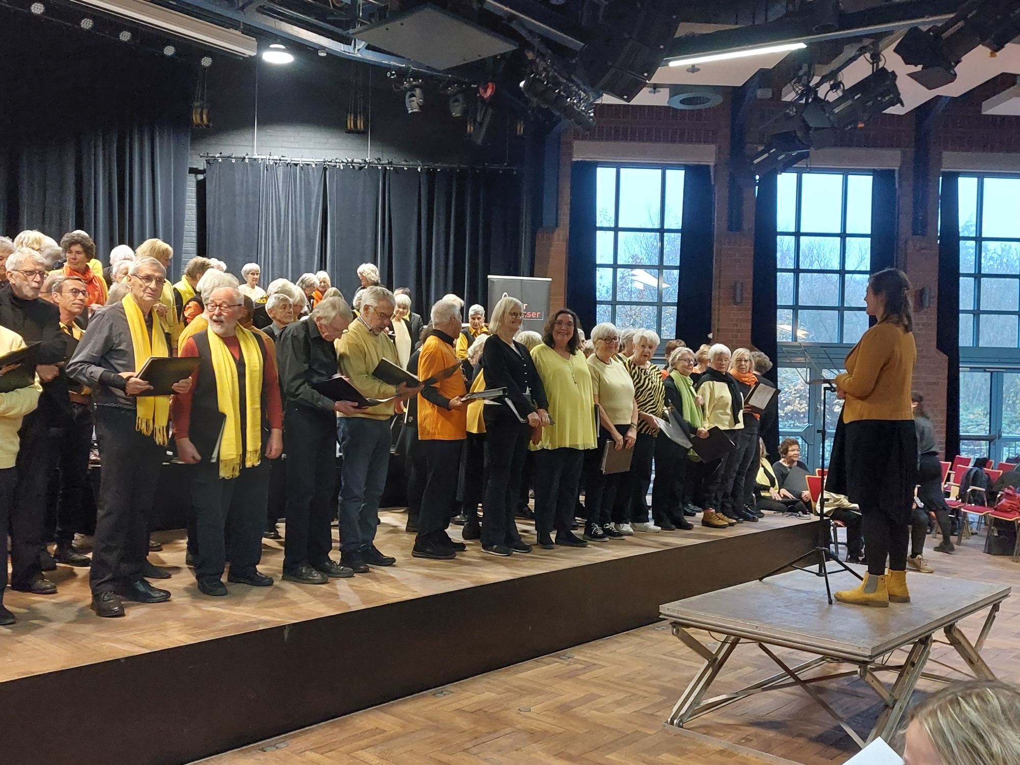 Nach 2 intensiven Probeeinheiten und einer Stellprobe, konnten wir uns noch einmal entspannen begann das Konzert um 16:00 Uhr. Inka Stubbe, die Geschäftsführerin von älter & besser und unser "Häuptling", leitete souverän durch das Programm. Die Chorleiterinnen und Chorleiter Hanna Ramminger von der Eppendorfer Spätschicht, Michael Jan Haase vom Chor N°7 aus Altona und Nele Quaas vom Langenhorner Chor dirigierten uns durch das Repertoire.
